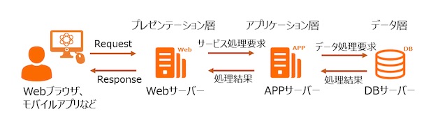 Web3層アーキテクチャは、ユーザインターフェースとなるWebサーバ層(プレゼンテーション層)、アプリケーション処理となるAPPサーバ層(アプリケーション層)データ処理や保存更新するDBサーバ層(データ層)で編成しながら、Webアプリケーションの構造化の原則を定義した多層アーキテクチャです。