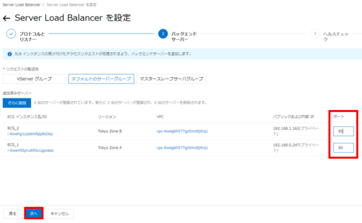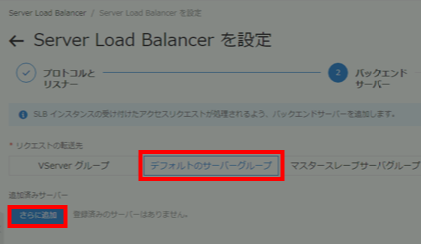 リクエストの送信先をデフォルトのサーバーグループを選択し、【さらに追加】をクリックします。クリック後、リスナーの追加画面が表示されますので対象のインスタンスにチェックを入れ、【次へ】をクリックします