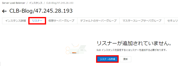 ④ リスナーのタブをクリックし、【リスナーの作成】をクリックします。