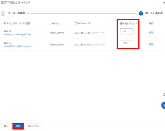 重みは 0 ~ 100までの値を指定出来ます。重みを0に指定した場合、バックエンドサーバにリクエストが転送されなくなりますので、ご注意ください