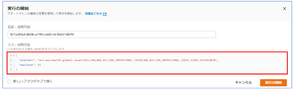 ステートマシン実行後、「実行の開始」の画面の「入力」のところに、Step Functions に渡したペイロードが消え、コードの記述がなくなります。
