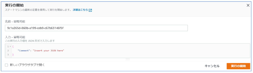2⃣ 現れる「実行の開始」の画面の「入力」のところに、Step Functions に渡すペイロードを入力します。