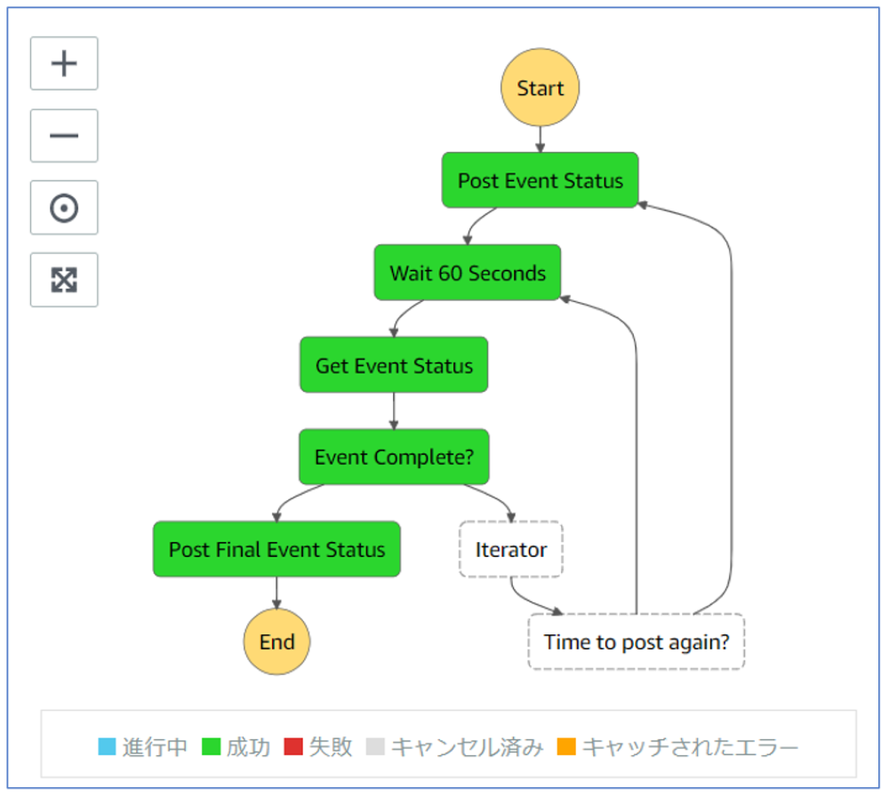 ステートマシンの実行が成功したら、画像のように各ステップが緑色で表示されます。