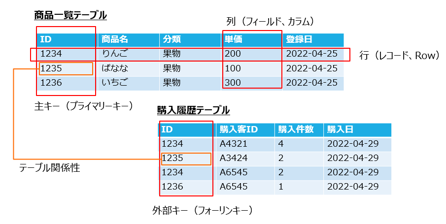 リレーショナルデータベースは関係性を持ったテーブル構造、すなわちリレーショナルモデルデータベースです。リレーショナルデータベースは、データを行(あるいはレコード)と列(あるいはフィールド、カラム)のテーブルに構成するモデルを使用します。通常、列はデータのカテゴリを表し、行は個々のインスタンスを表します。これらのテーブルは、キーを使ってリンクしたり関連付けたりすることができます。テーブルの各行は、主キー(プライマリーキー)と呼ばれる一意のキーで識別されます。この主キーは、別のテーブルに追加して、外部キーにすることができます。主キーと外部キーの関係は、テーブルとテーブル間の関係を成立させるための役割をもたらしつつ、データを正規化することが可能です。