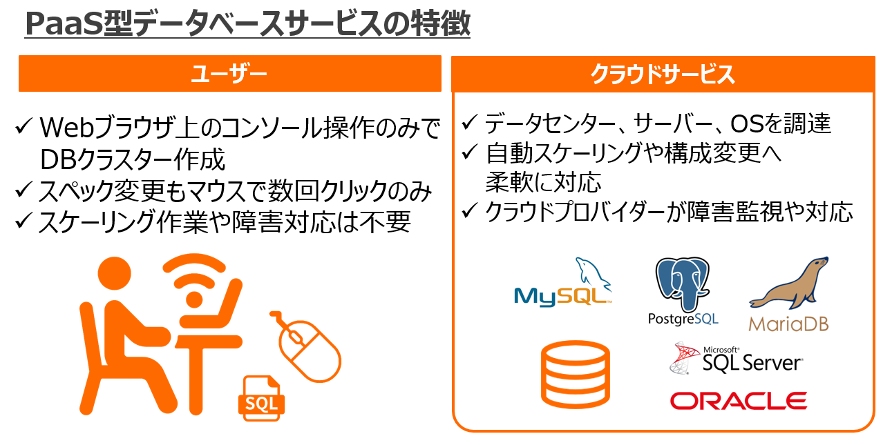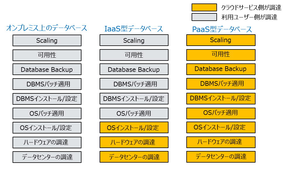 オンプレミス上のデータベース、IaaS型データベース、PaaS型データベースそれぞれクラウドサービス側が調達してくれる利用範囲をまとめてみます。オレンジ色で塗りつぶしてるところはクラウドサービス側が調達してくれるため、利用ユーザ側による調整作業が不要となります。この利用範囲から、PaaS型データベースはほぼクラウドサービス側が調達してくれるため、非常に便利だということがみえます。