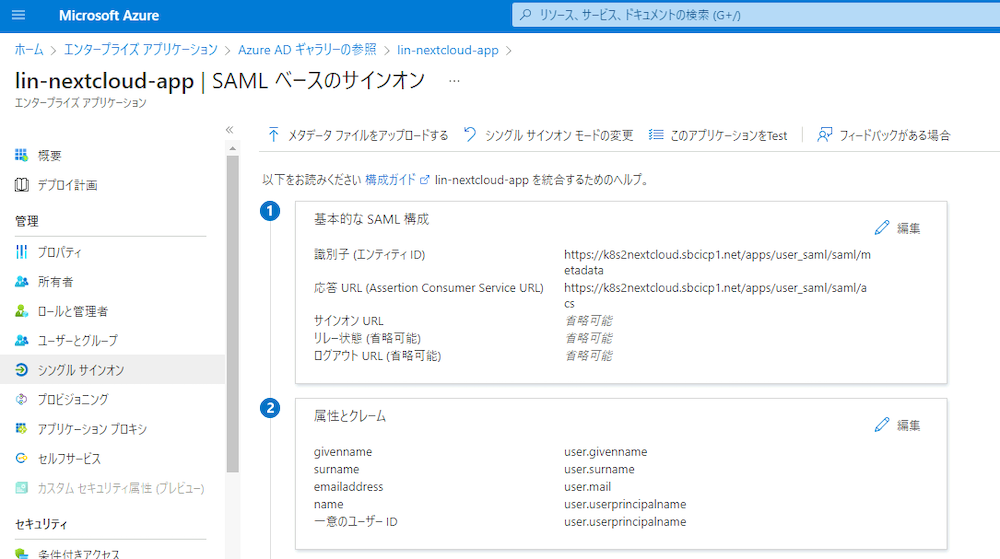 応答URL:https://k8s2nextcloud.sbcicp1.net/apps/user_saml/saml/acs
