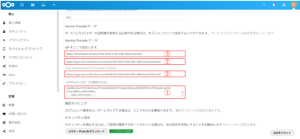 Nextcloudのバージョンによって、①SAML署名証明の証明書(Base64)に登録する内容が異なりますので、Nextcloudの設定画面の注釈を見て設定します。
