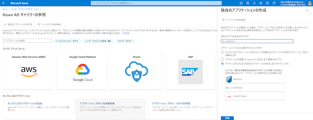 Azureコンソール画面にて、【エンタープライズアプリケーション>Azure ADギャラリーの参照】 で 独自のアプリケーションを作成します。