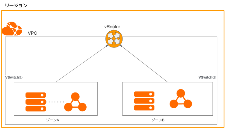 上記はVPCにvRouterとCIDR ブロック、vSwichで構成されているオーソドックスなアーキテクチャとなります。vSwitchはサブネットに該当しVPC内に複数のvSwitchを作成してネットワークを分けていくイメージです。