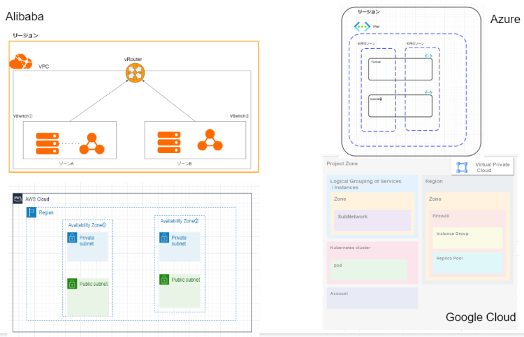 Alibaba CloudとAWSはオーソドックスなネットワーク構成が読み取れました。