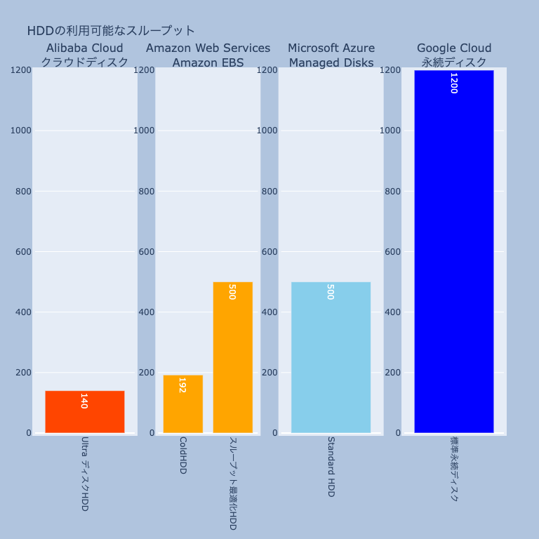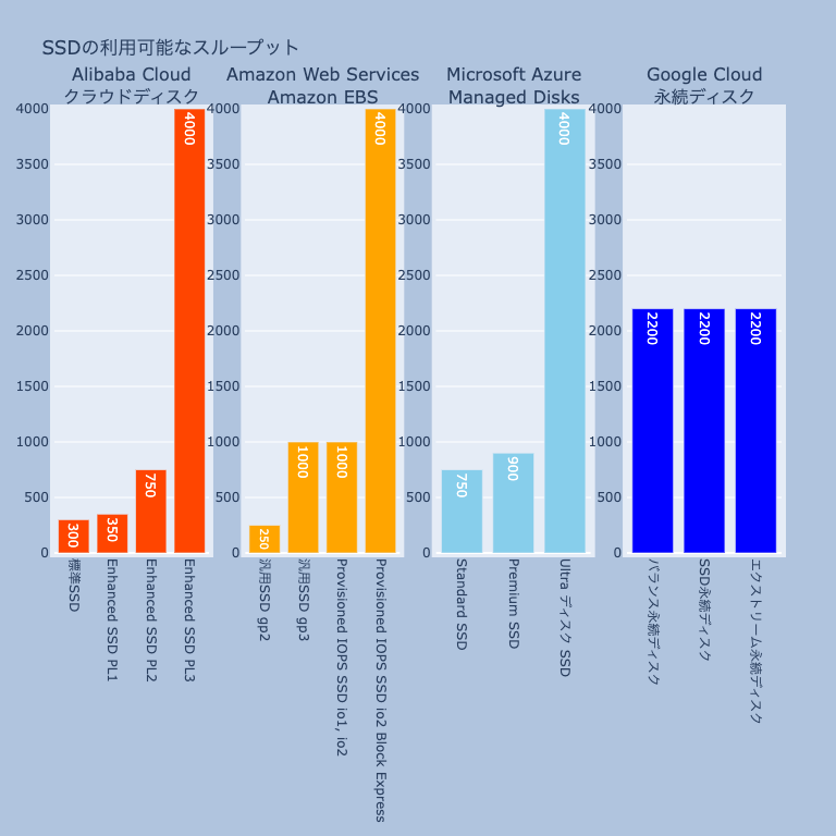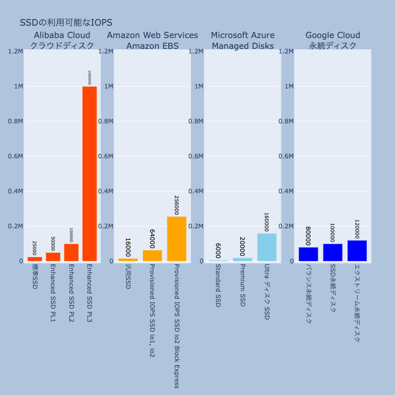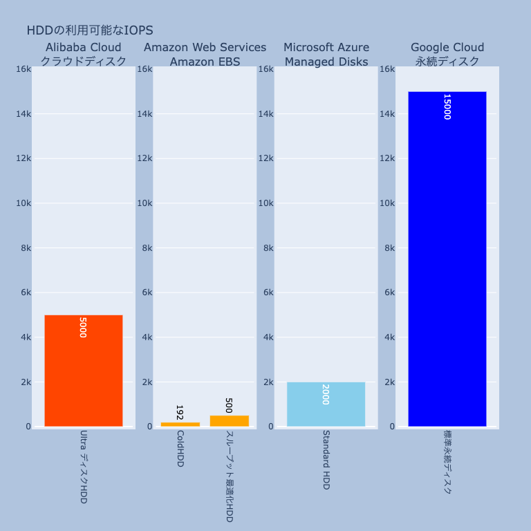 総じてHDDより大幅に高い値になっていますが、とりわけAlibaba CloudのEnhanced SSD PL3は突出していますね。