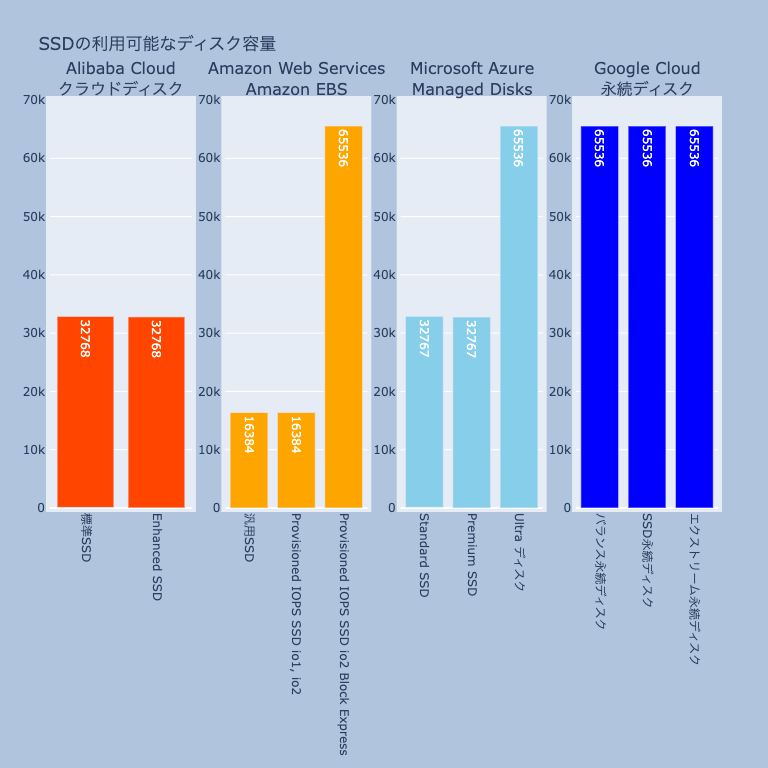 SSDの利用可能な最大ディスク容量のレンジは、16,384ギガバイトから65,536ギガバイトまでとなっています。