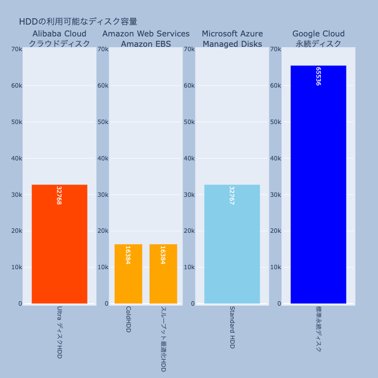 HDDの利用可能な最大ディスク容量のレンジは、16384ギガバイトから65536ギガバイトまでとなっています。