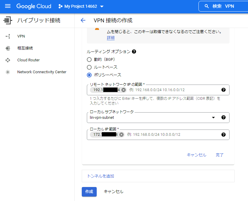 また、「Local Network」にはAlibaba Cloud側セグメントを、「Remote Network」にはGoogle Cloud側セグメントを指定します。