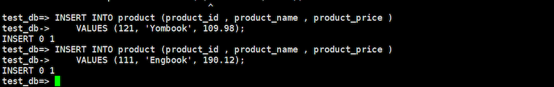 INSERT INTO product (product_id , product_name , product_price ) VALUES (121, 'Yombook', 09.98); INSERT INTO product (product_id , product_name , product_price ) VALUES (111, 'Engbook', 90.12);