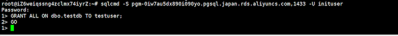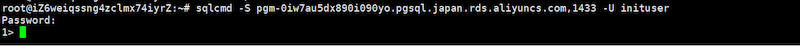 # sqlcmd -S pgm-<user endpoint>.pgsql.japan.rds.aliyuncs.com,1433 -U inituser