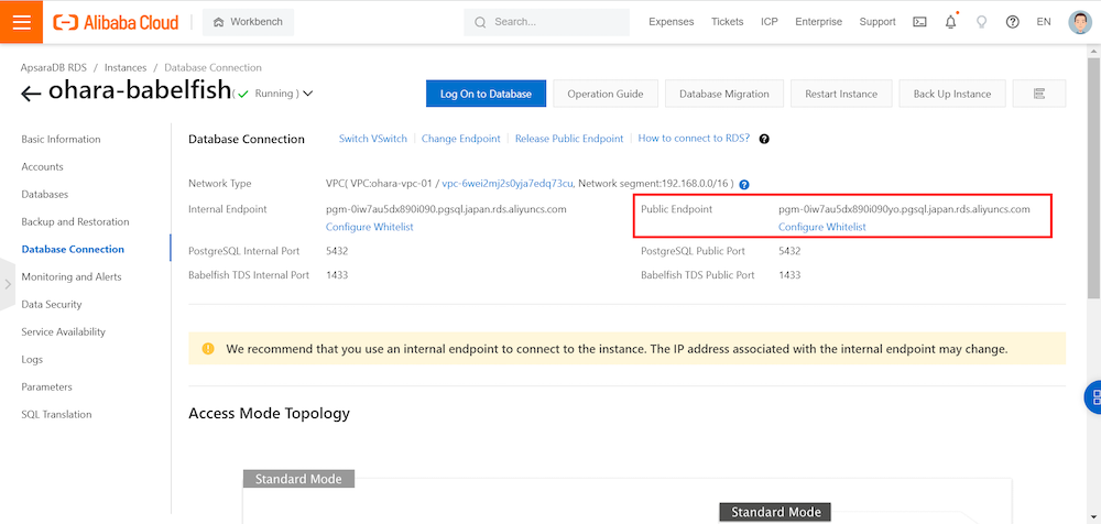 接続エンドポイントとして、PostgreSQL CLIツールからApsaraDB for PostgreSQLへ接続する際は、コンソール画面に表示されているEndpoint(pgm-<user endpoint>.pgsql.japan.rds.aliyuncs.com )、および、Port 5432を選定します。
