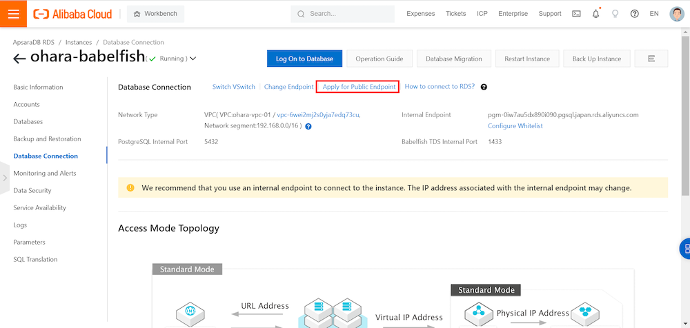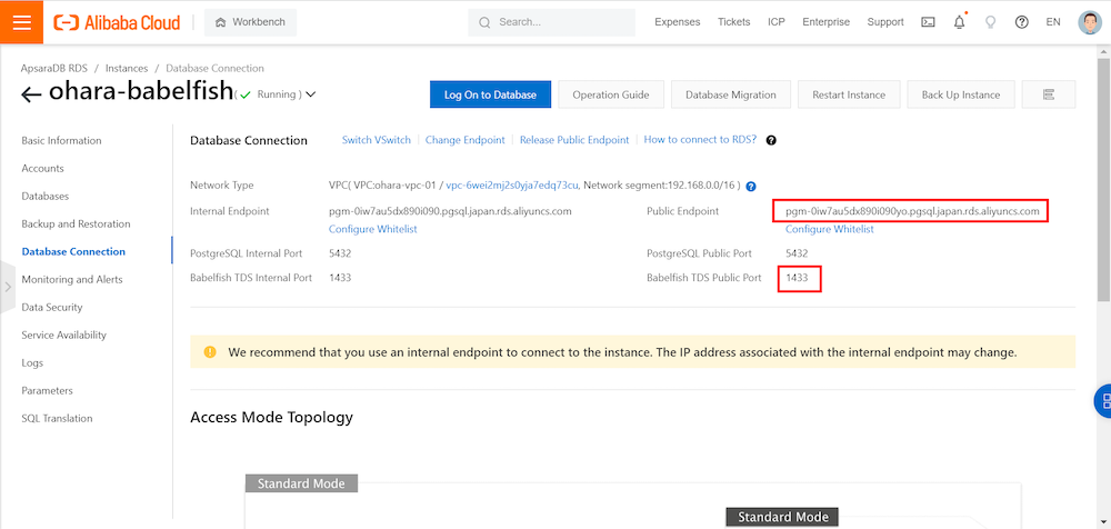 接続エンドポイントとして、SQL Server CLIからApsaraDB for PostgreSQLへ接続する際は、コンソール画面に表示されているEndpoint(pgm-<user endpoint>.pgsql.japan.rds.aliyuncs.com )、およびBabelfish TDS ポート 1433 を使用します。