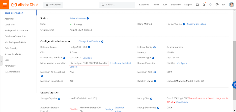 コンソールからApsaraDB for PostgreSQLインスタンスを作成します。その際、コンソール画面にてBabelfish機能がありますので、これをチェックし有効化します。Babelfish機能は現在PostgreSQL13、14のみサポートしています。
