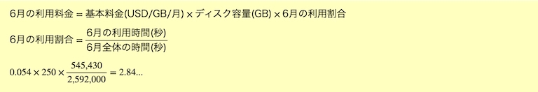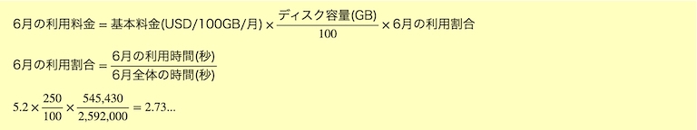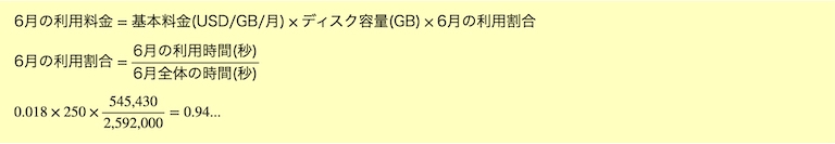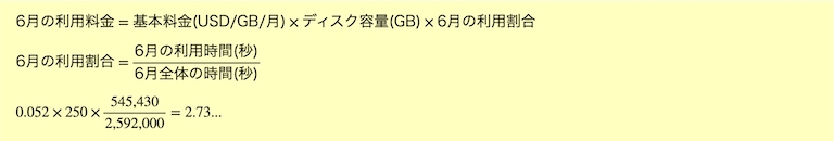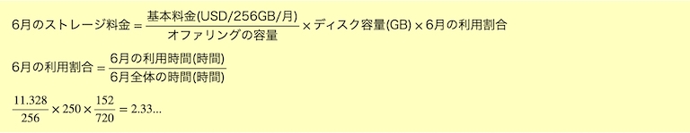 また、課金単位時間は1時間となるため、6月全体の時間は720時間となり、実際にストレージ容量を確保していた時間は「6日8時間=152時間」となります。