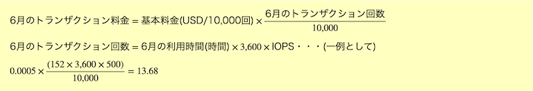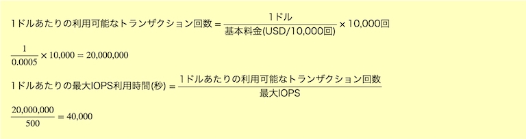 ちなみに、1ドルあたりの利用可能なトランザクション回数は2,000万回で、IOPSをフルに使った場合の利用可能な時間は40,000秒(約11時間)となります。計算式は以下の通りです。