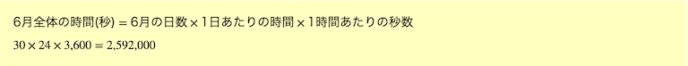 まず、6月全体の時間は2,592,000秒になります。計算式は以下の通りです。