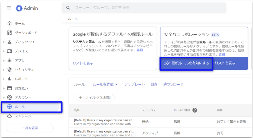 Google Workspace 管理者コンソールにログインし、「ルール」の中で、信頼ルール機能を有効化することができます。以後、同じ画面で各種のルールを追加・編集する形でファイル共有機能を制御できます。又、「信頼ルール」を有効化した後、従来の制御機能の設定が無効化されます。