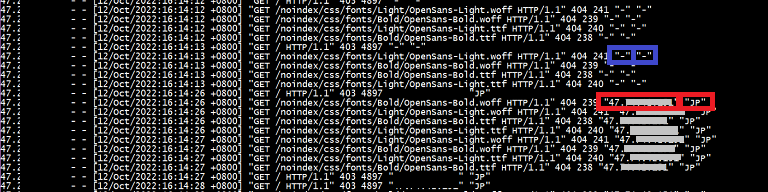 EdgeScript設定前が青枠、EdgeScript設定後が赤枠です。クライアントIPアドレスと国名コード(日本なのでJP)が表示されました。