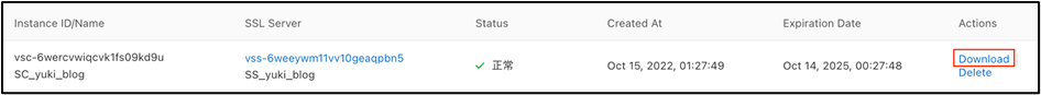 ⑩ 作成されたClient Certificateの「Action」で「Download」をクリックし、クライアント証明書をダウンロードします。「Download」をクリックするとca / crt / key / ovpnの4ファイルが入ったフォルダがダウンロードされます。