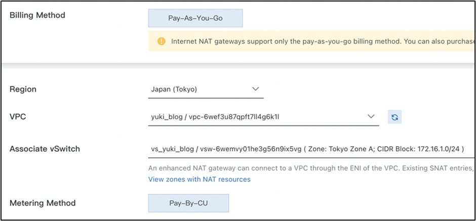 Internet NAT GatewayとVPC NAT Gatewayの課金方式は、従量課金方式で、課金項目はインスタンス料金とCPU料金が課金されます。