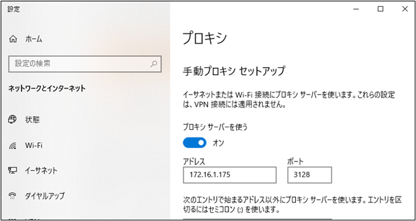 ② 手動セットアップで「プロキシ サーバーを使う」を有効化し以下の通り、設定します。