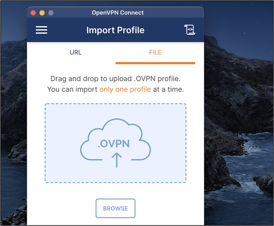 OpenVPN Connectの場合、作成したovpnファイルをドラッグ&ドロップで接続の追加ができます。