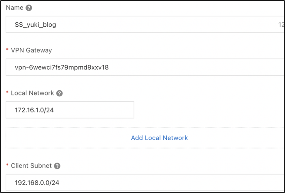 クライアントPCからAlibaba Cloud VPN gatewayに対して、SSL-VPN接続を行い、ECS(Proxy)を経由して、NAT GatewayでプライベートIPアドレスをグローバルIPに変換(NAT)させます。NATさせたIPについては、EIPをバインドしているため、固定グローバルIPとなります。