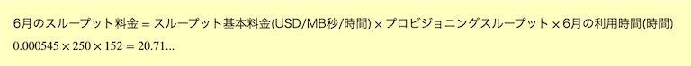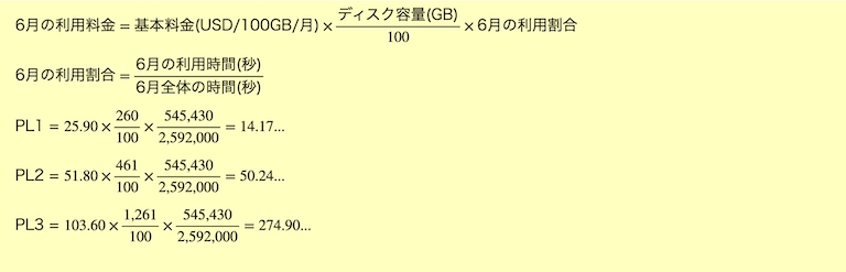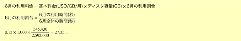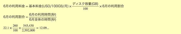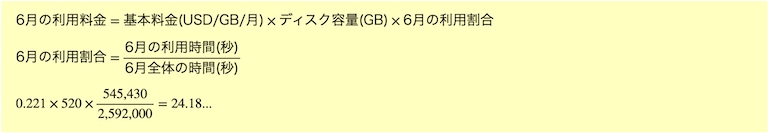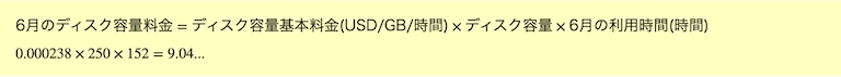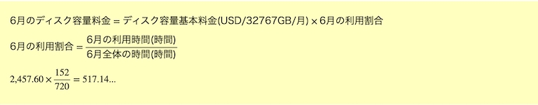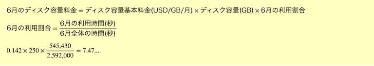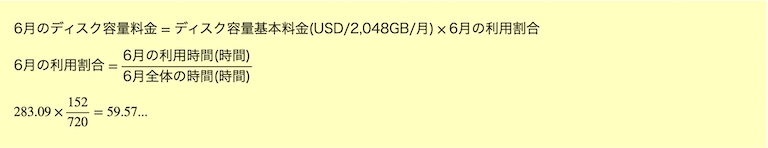 また、課金単位時間は1時間となるため、実際にディスク容量を確保していた6日間7時間30分30秒は6日間8時間=152時間となり、6月全体の時間も720時間となります。