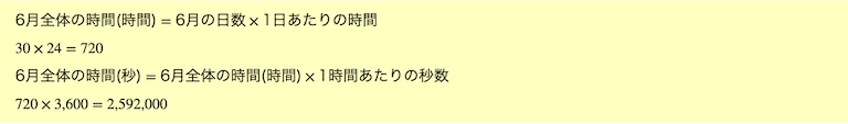 まず、6月全体の時間は2,592,000秒になります。計算式は以下の通りです。