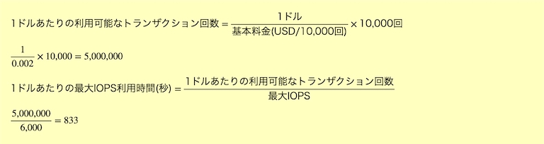 ちなみに、1ドルあたりの利用可能なトランザクション回数は500万回で、IOPSをフルに使った場合の利用可能な時間は833秒(約13分)となります。計算式は以下の通りです。