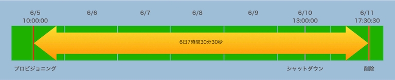 つぎに、実際にストレージ容量を確保していた期間は上の図にある通り、「6/5 10:00:00」から「6/11 17:30:30」までの「6日7時間30分30秒」です。秒に換算すると545,430秒になります。