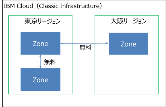 「プライベート・ネットワークのデータ転送が無償」についてあらためて紹介する前に、IBM Cloudのリージョンとゾーン、それを結ぶプライベート・ネットワークについて簡単にまとめておきます。