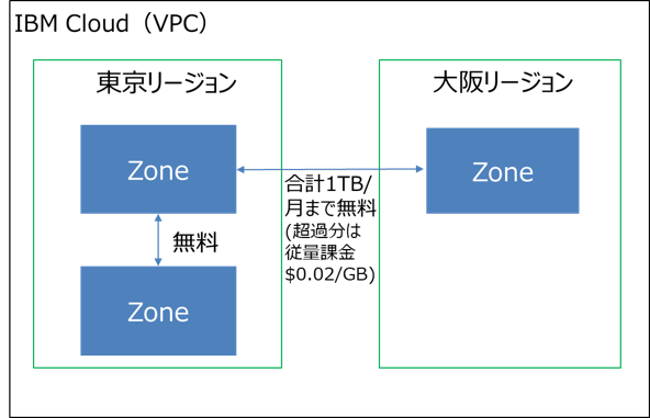 なお、IBM CloudにはClassic以外にも第二世代と呼ばれる最新IaaSサービスであるIBM Cloud Virtual Private Cloud(VPC)も提供しております。IBM Cloud VPCは他メガクラウドで提供されているVPCサービスと基本的な位置づけや特長はよく似たサービスとなっております。このVPCでも同じリージョン内のゾーン間のプライベート・ネットワーク通信は無料です。ただしリージョン間の通信は有償となりますのでご注意ください。以下の図の例を参照ください。なお、有償とは言え毎月1TBまでは無料です。 1TB を超えると1 GB あたり 0.02$ が課金されます。(2022年9月時点になります)。