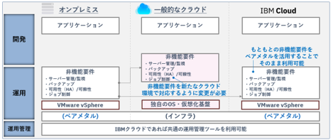 このIBM Cloudのベアメタルサーバがあるからこそ、オンプレミスで運用しているVMware製品による仮想環境を変更することなくそのままクラウドに移行することができます。VMware on IBM Cloudを利用することにより、アプリケーションだけでなく、現在オンプレミスで実現している非機能要件の実装をそのままクラウドに移行できることに加え、今あるVMware製品のスキルも活用することができます。移行のコストを極少に抑えつつ、パブリッククラウドのメリットである俊敏性やコスト構造の変革が得られます。