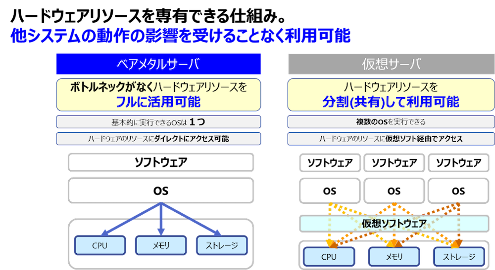 さて、VMware on IBM Cloudの紹介の前に、それを支えるIBM Cloudのベアメタルサーバ(物理専有サーバ)について紹介します。IBM Cloudのベアメタルサーバは、お客さまが専有の物理サーバをご利用していただくことができるクラウドサービスです。物理サーバを専有することにより処理パフォーマンスを安定的かつ最大限利用することができ、また他のお客さま環境とは隔離された安心感のあるサーバ環境を実現することができます。また、CPU、メモリ、ストレージ、ハイパーバイザ、OSなどの構成要素を柔軟に組み合わせることができるので、小規模な構成からお客さまの要件にあわせてカスタマイズすることができます。