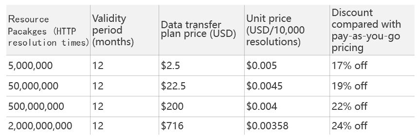 HTTPDNSはHTTP解決の数に基いて課金されます。これが基本となり、PAYG(従量課金)とResource Pacakges(解決の数をオフセット)があり、また無料枠もあります。