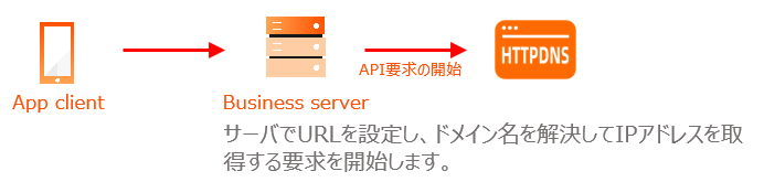 流れとしては、ユーザはモバイルアプリなどからHTTPDNSのAPIを呼び出して、ドメイン名構成管理システムからIPアドレスを問い合わせます。このIPアドレスを使用して、最適な待機時間で必要なビジネスにアクセスすることができます。次に、クライアントはHTTPまたはHTTPSを使用してIPアドレスにリクエストを送信します。例えば、クライアントはHTTPDNSから取得したIPアドレスに対して、ホストヘッダを指定し、標準的なHTTPリクエストを送信します。