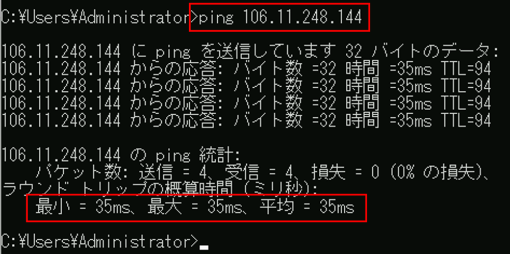 結果として、最小 35ms、最大 35ms、平均35msです。