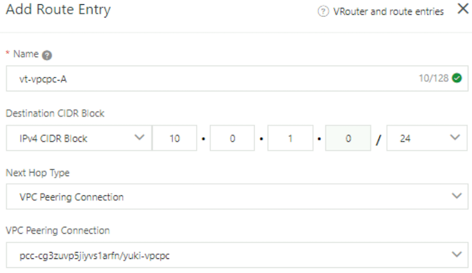 Destination CIDR Block : VPC AのvSwitchのCIDR Block (10.0.1.0/24)を指定します。