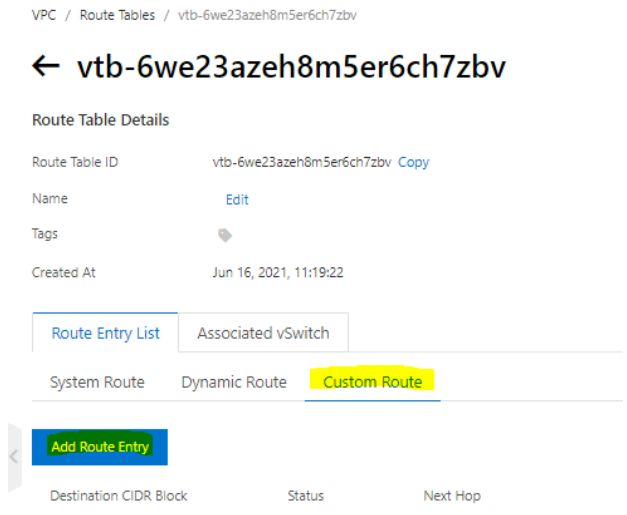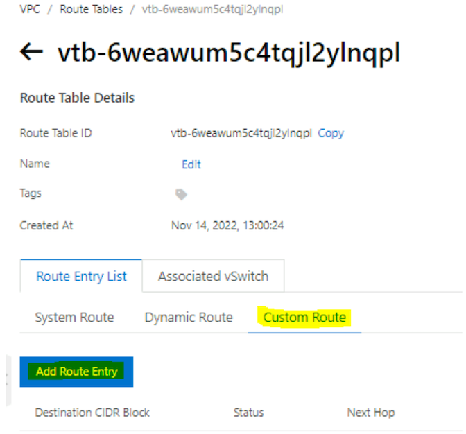 Initiator VPC (10.0.0.0/16)のRoute TableのCustom Routeで『Add Route Entry』をクリックし、エントリを作成します。
