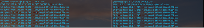 pingを実行すると、別VPCに属するECSから応答が返ってきており、異なるVPC同士の接続ができていることが分かります。