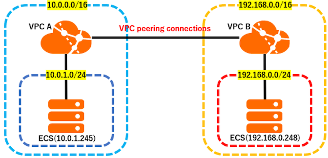 <環境詳細>に記載があるCIDR BlockでVPC, vSwitchを作成します。作成後、2つのVPCに作成したvSwitchのCIDR Blockに1台ずつECSインスタンスを作成します。