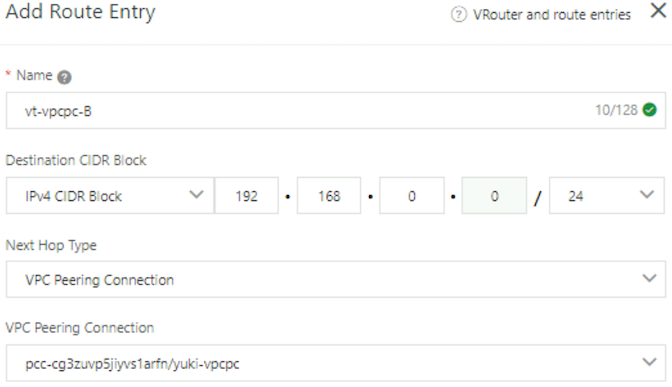 Destination CIDR Block : VPC BのvSwitchのCIDR Block (192.168.0.0/24)を指定します。