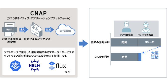 CNAPは、標準化されたアプリケーション実行環境を手軽に利用できるサービスです。リリースプロセスを自動化し、開発者自身がセルフサービスで実行環境を準備できるようになります。